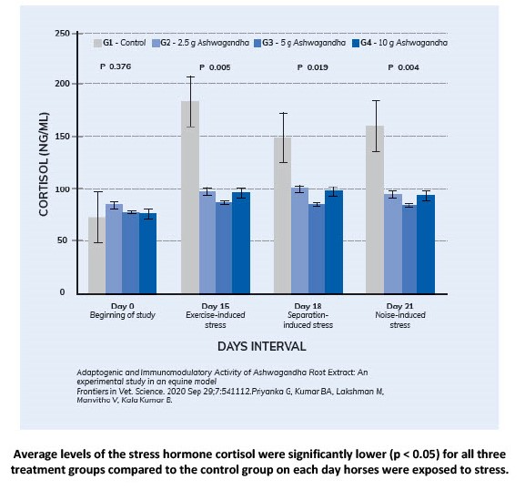 Horses are highly responsive to environmental stimulation (stress). The ability to adapt to various sources of stress remains a great challenge for horses. Supplements containing adaptogenic botanicals, such as Ashwagandha root extract, may help maintain proper physical and psychological balance, or homeostasis, in horses. This study was designed to determine the effects of Ashwagandha root extract on horses exposed to three commonly occurring types of stress in the equine environment: exercise, noise, and separation.