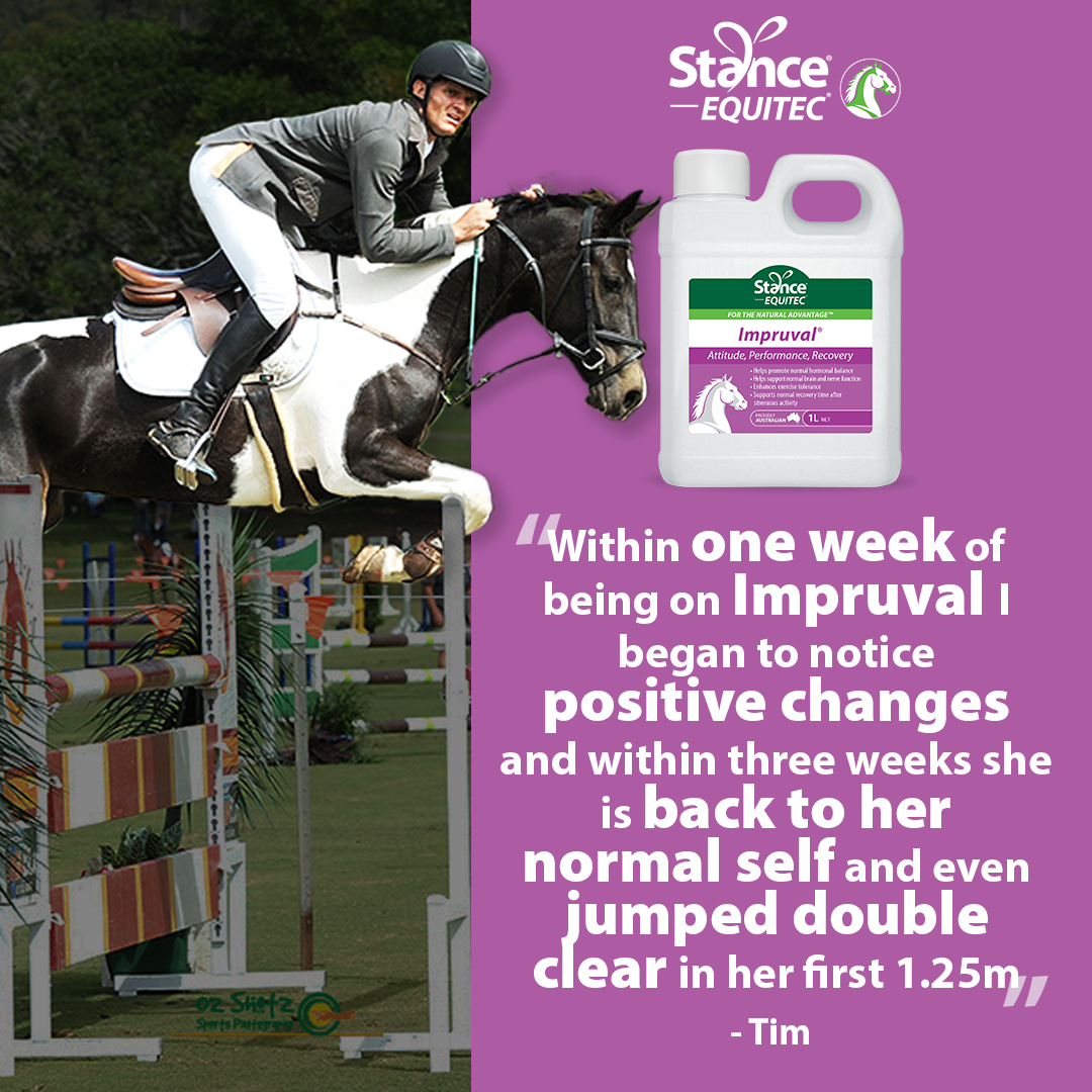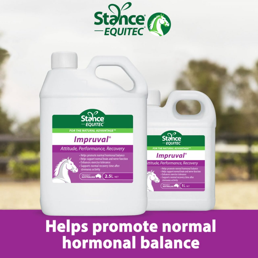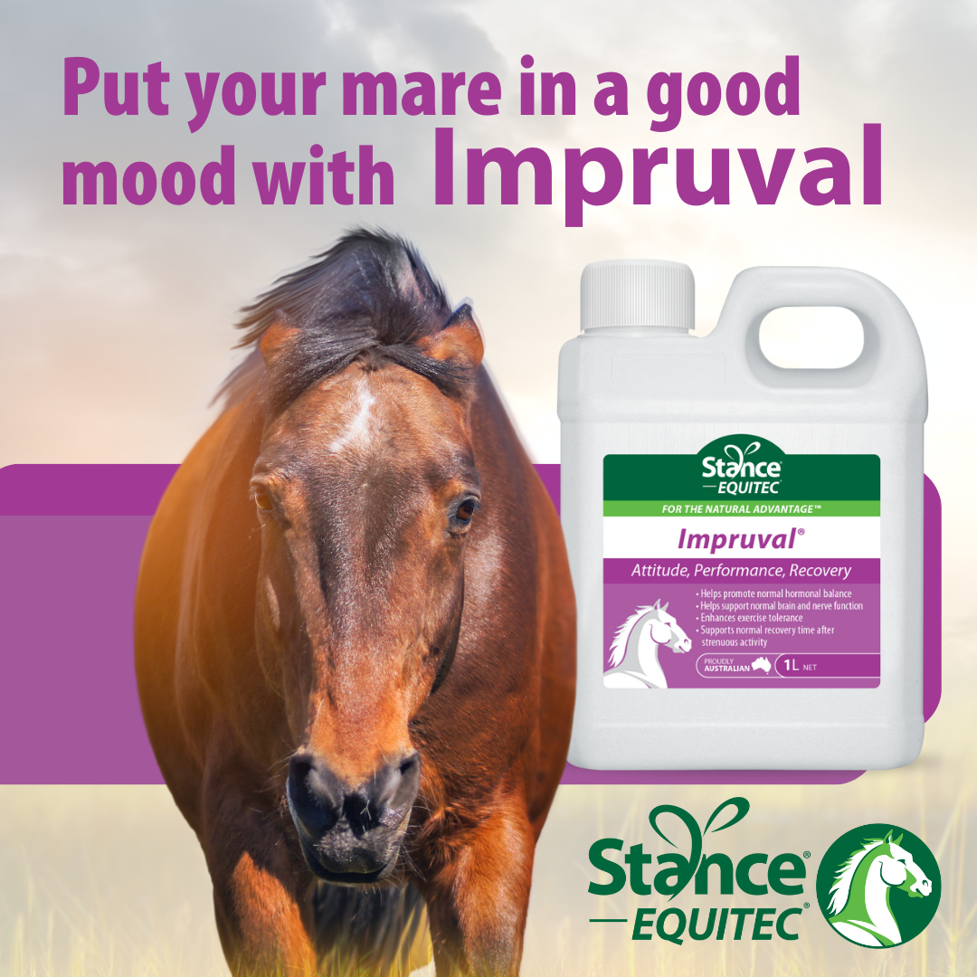 Impruval may offer benefits for hormonal mares by supporting normal hormone balance and also may be beneficial as a pre and post event recovery supplement for all horses. During periods of intense activity, particularly during multi-day events, a horses nutritional requirements are significantly increased. This includes a greater demand for vitamins, minerals, electrolytes and energy. If these demands are not met, horses may suffer stress which may lead to ulcers, build up of lactic acid in muscles and poor recovery time. Impruval contains a mixture of herbal and nutritional ingredients which may support digestion and mineral intake, normal stress levels and normal recovery time. Impruval may also support the horses normal endocrine system.