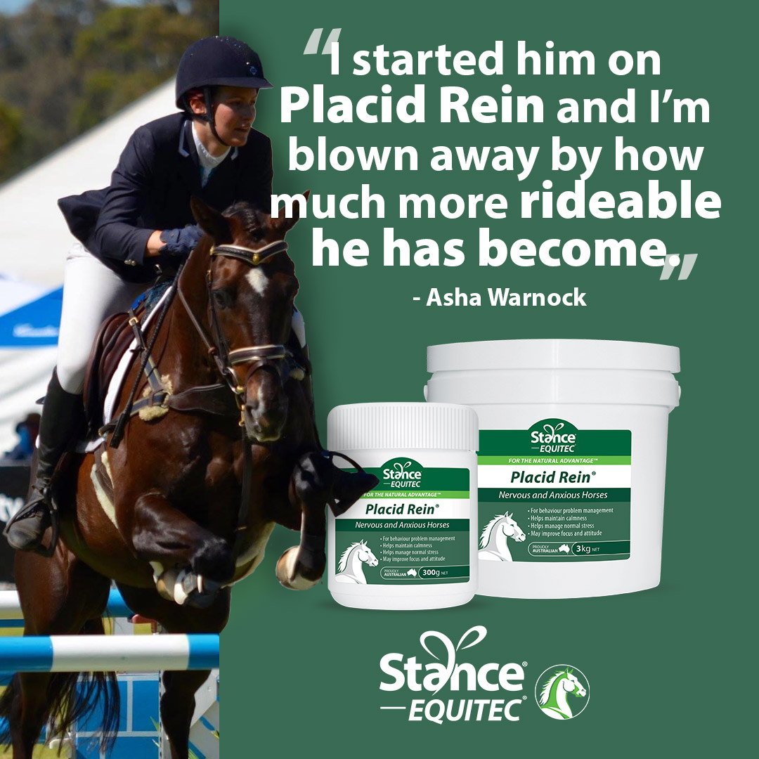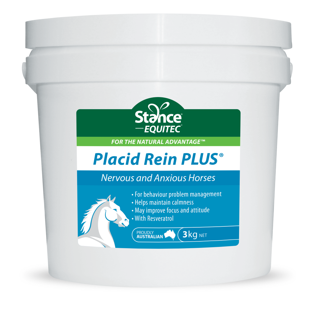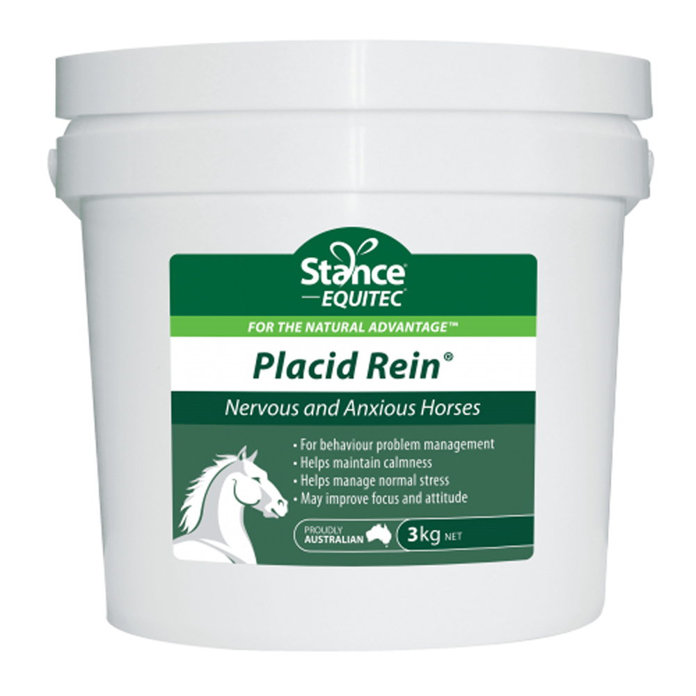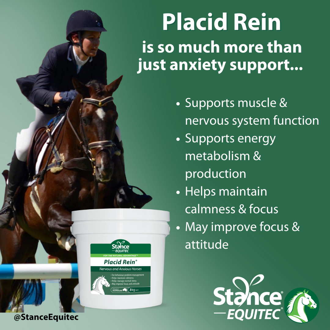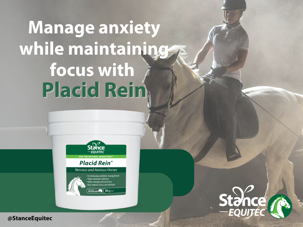 Use calming supplements: There are many supplements available, Stance's Placid Rein contains a proprietary blend of natural ingredients including: the B Vitamins group, Magnesium sulphate, Magnesium proteinate, Tyrosine, Glutamic acid, Seaweed derived calcium, B-glucans, Baikal skullcap and Diamond V Yeast XPC. Placid Rein has been designed to support normal body responses to stress in horses and to help maintain a consistent attitude to work whether at home or away.