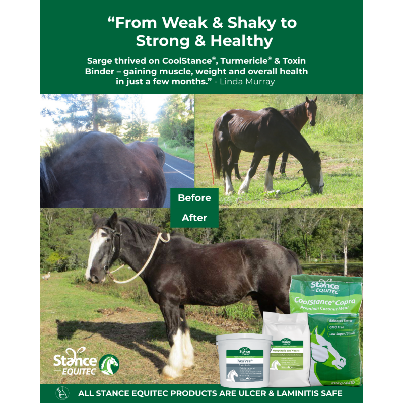 Sarge’s transformation using CoolStance®, Turmericle® and Toxin Binder In February an approx. 20 year old gentle giant arrived after a 2,200km journey. He was staying with me for around 2-3 months before travelling his last leg to his new owner.. Read More