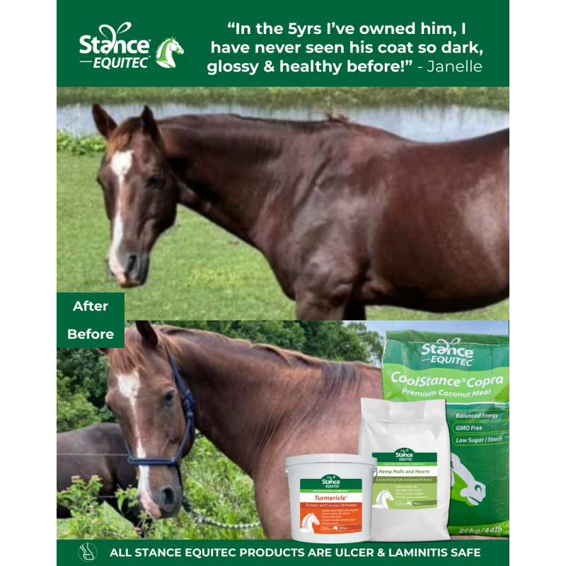 My 16yo QH/Paint had been looking dull and washed out. I increased his CoolStance Copra, added Hemp Hulls & Hearts and Turmericle to his feed. Within a month his colour and shine was amazing, and he was cantering around the paddock clearly feelin.. Read More