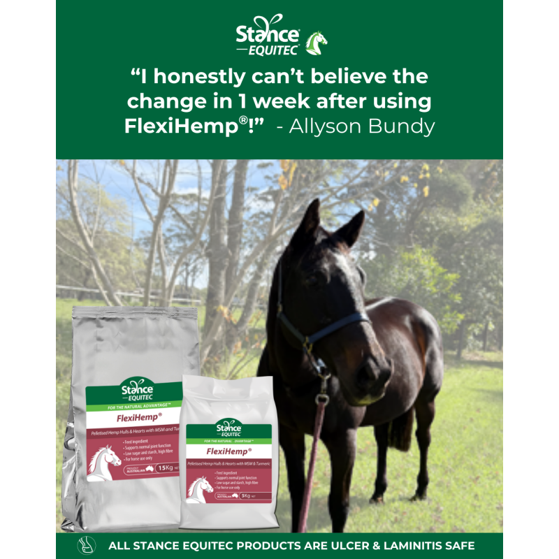 "We’ve finished our first bag of FlexiHemp and are so happy with how gorgeous her coat now is. I’ve also found she’s more comfortable during warm-up in the cold and rainy weather when on FlexiHemp, she would otherwise be a little hesitant and ‘sticky..