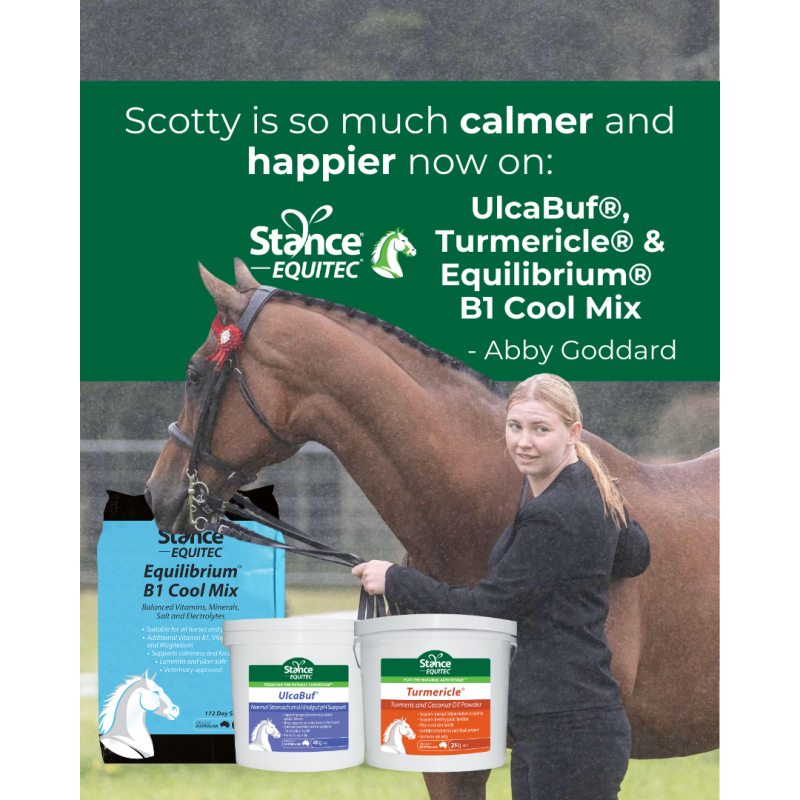 “I love the Stance Equitec products because they are made with natural ingredients which keep my horses in tip top condition I use Equilibrium B1 Cool Mix, CoolStance®, Turmericle® and UlcaBuf® on my horses. I started UlcaBuf® and Turmericle® a couple of weeks ago and already have noticed a big change with my thoroughbred Scotty, his whole attitude has changed he's so much calmer and is happier now. All my horses love CoolStance® Copra especially our foal.” - Abby Goodard