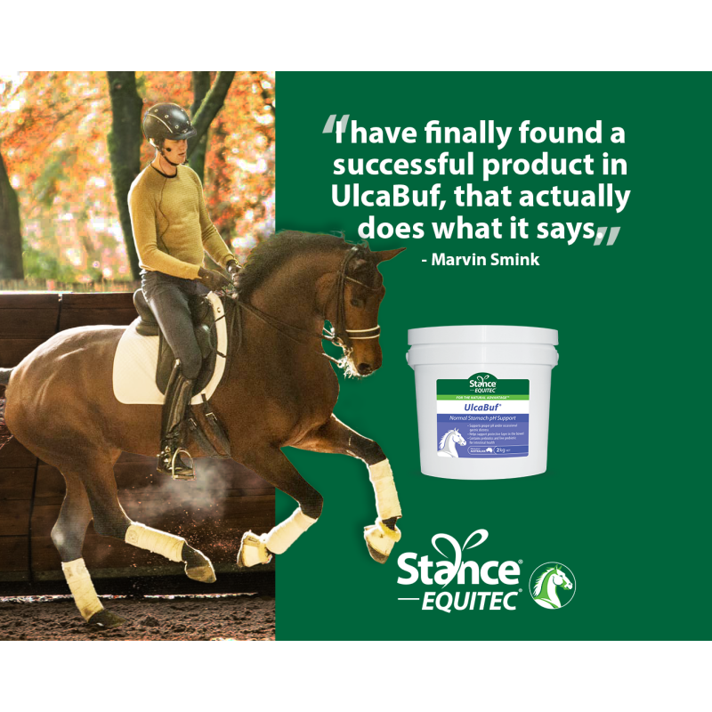 “In my time working as a professional rider I have dealt quite a few times with new horses that came in with stomach ulcers and it really took a while to figure out how to deal with it. So many options… As a preventative I have finally found a successful product in Stance Equitec UlcaBuf, that actually does what it says. It is a seaweed derived calcium based supplement that will neutralise the PH levels in the gut and hindgut. This together with a high fibre diet and slippery elm powder has really made a difference for my horses and my client’s horses that have dealt with stomach ulcers. The results are astounding."- Marvin Smink
