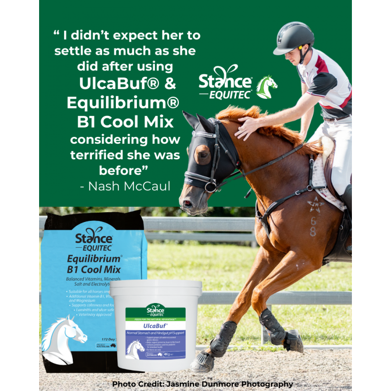 "I use CoolStance® Copra as my go to for my Ulcer prone horses knowing it is a safe feed, it doesn't give them any fizz, keeps their coats lovely and shiny and they love it, needless to say. They get UlcaBuf® daily to help keep any ulcer issues under control." - Maree Whitlam