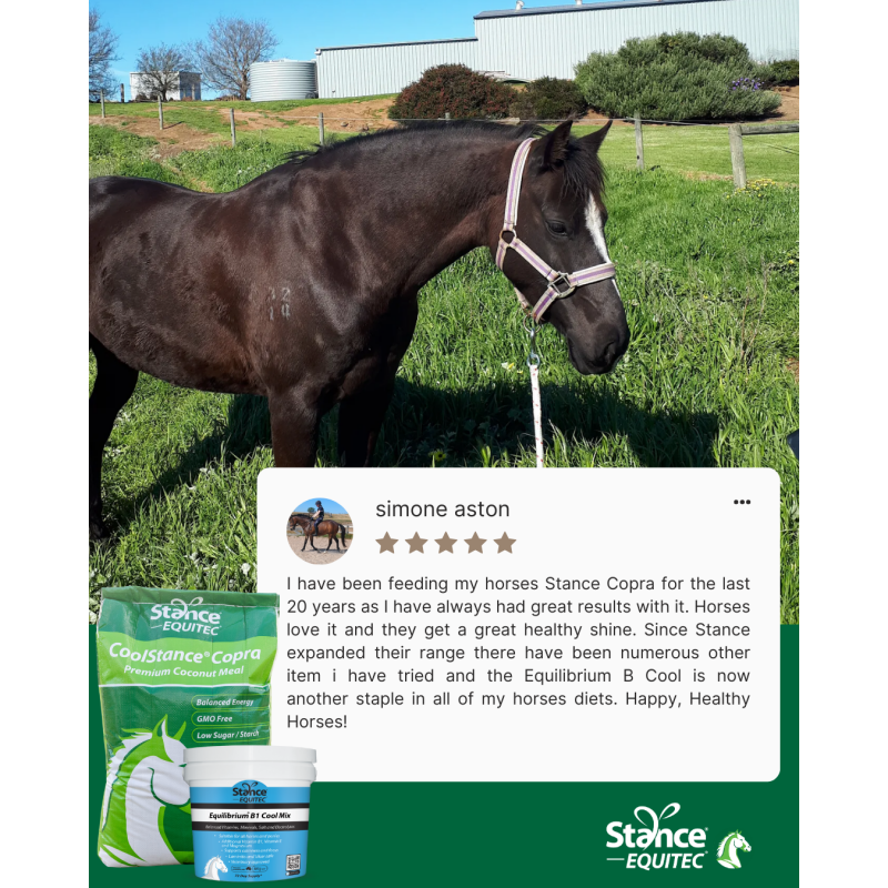 "Cool Energy feed rates are very low which makes it very economical. My daughters QHx has been it for a while and is looking great, is on very little grass and is only fed Stance products, she gets CoolStance® copra, Equilibrium® B1 Cool Mix and Cool Energy. - Katie Kennedy Read More